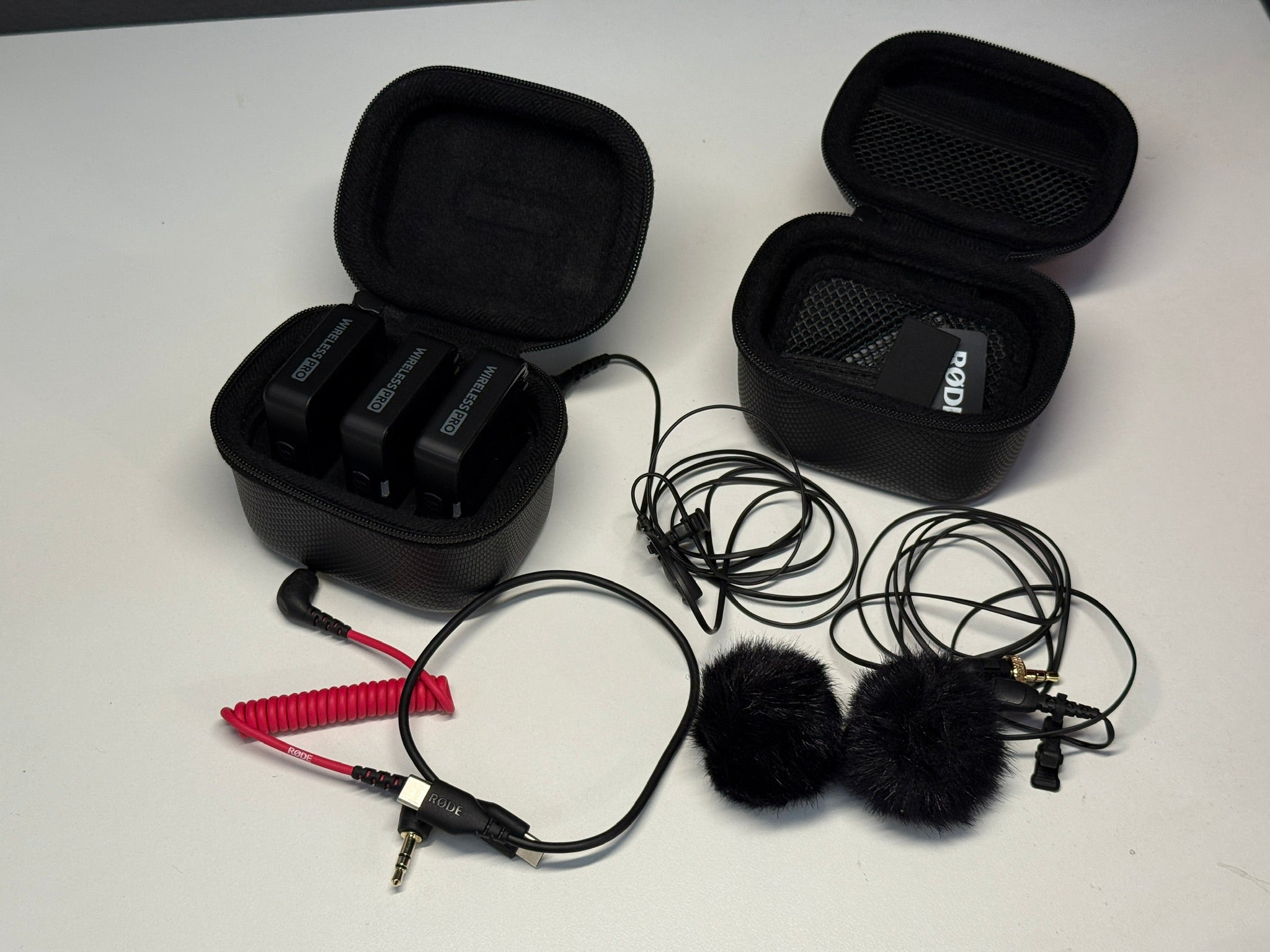 The RØDE Wireless Pro is a great wireless mic kit. This comes with the charging case, as well as the second case for all the accessories. I am not sure what all came with the original kit, but everything you see in this photo is included.
